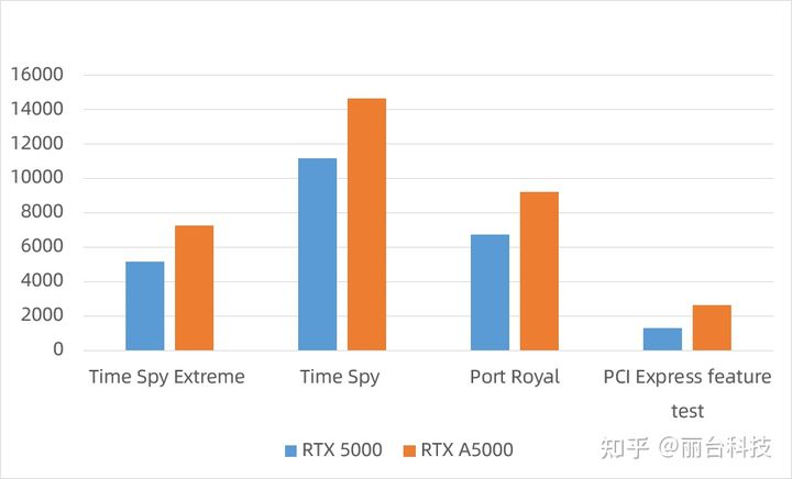 以上数据是RTX A5000和RTX 5000性能的对比情况,在专业制图应用中,RTX A5000性能都有10~20%的增幅。其中,Energy需要使用更多的计算资源,所以RTX A5000能够有50%性能提升。
